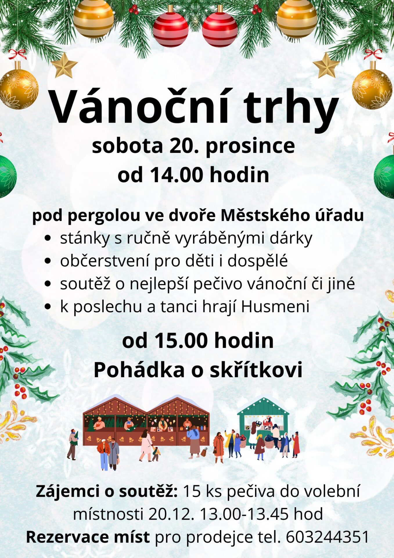 V sobotu 20.12. od 14.00 proběhne v Husinci na dvoře radnice již tradiční Vánoční trh. Budeme rádi, když se zúčastníte naší soutěže o nejlepší pečivo vánoční či jiné. K poslechu a tanci zahraje kapela Husmeni. Přijďte se pobavit, nasát vánoční atmosféru, koupit dárek pod stromeček, všichni jste srdečně zváni!